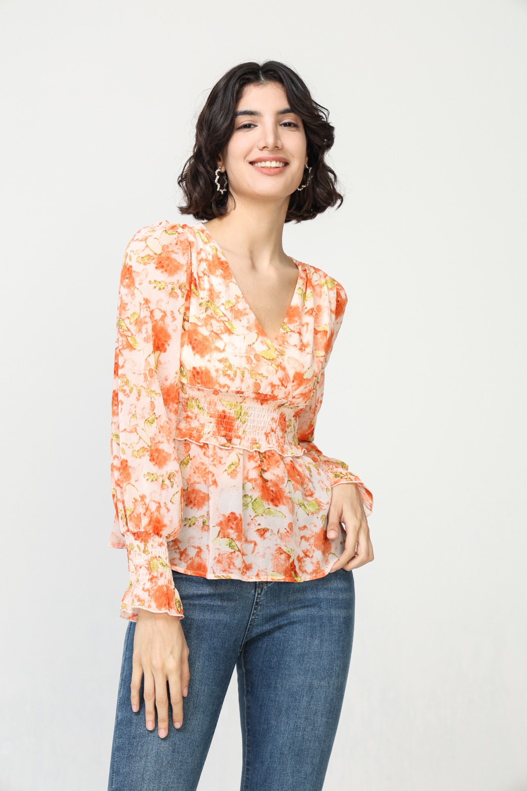 Blusa Ajustada Flores Naranjas Escote Pico