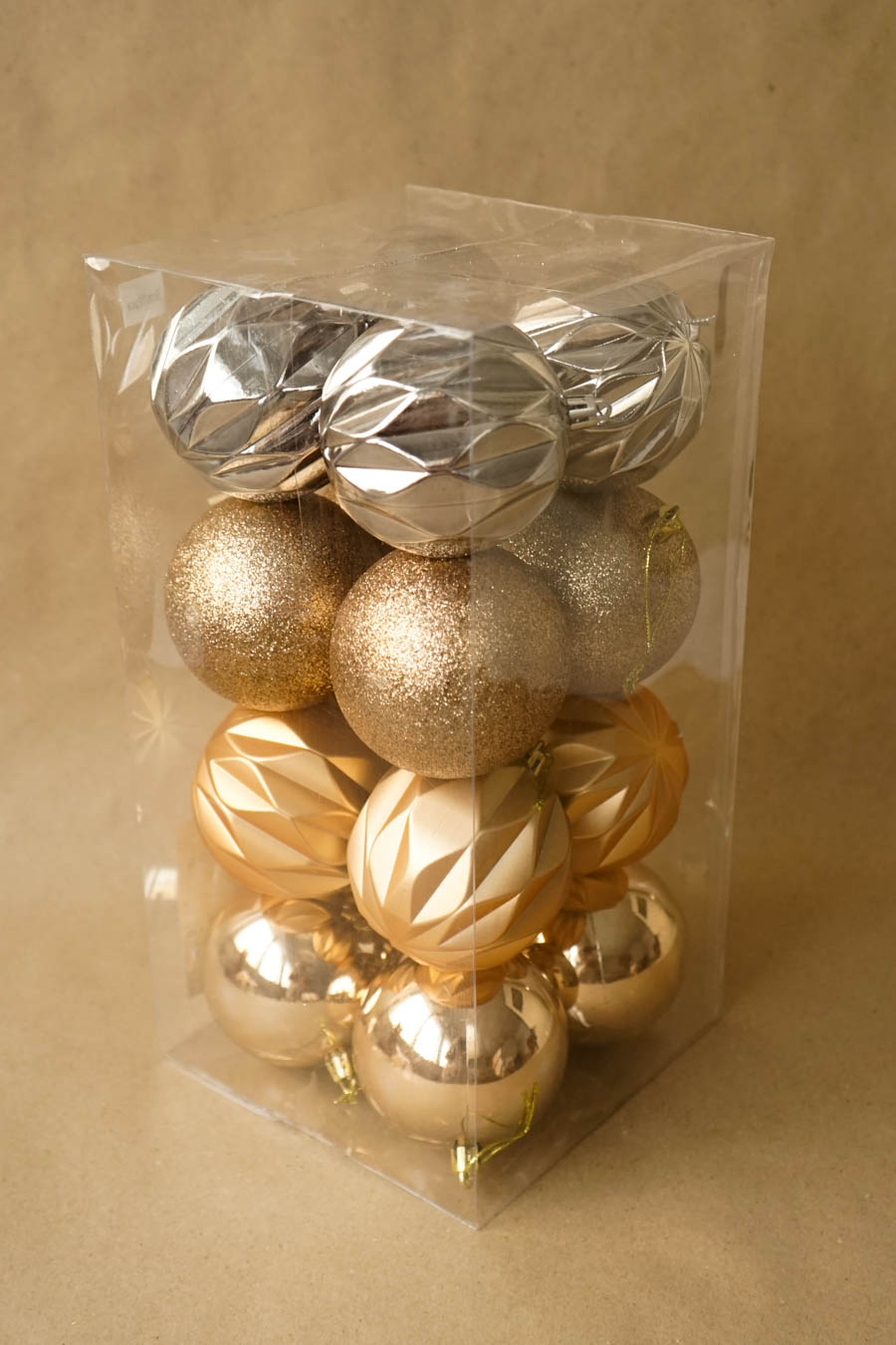 - Caja de bolas decorativas para árboles (16 bolas por caja), en 4 modelos diferentes (Brillante/Purpurina/Oro/Plata)