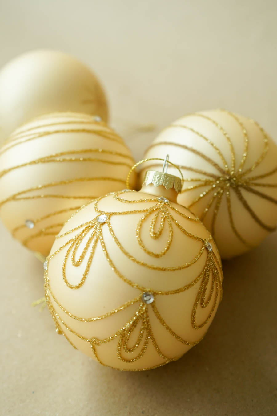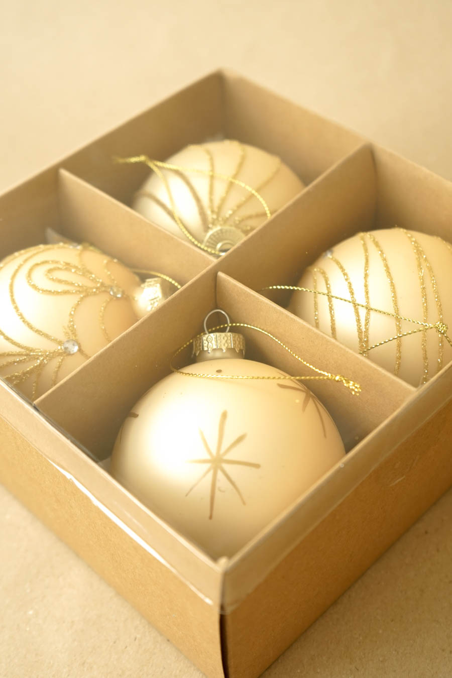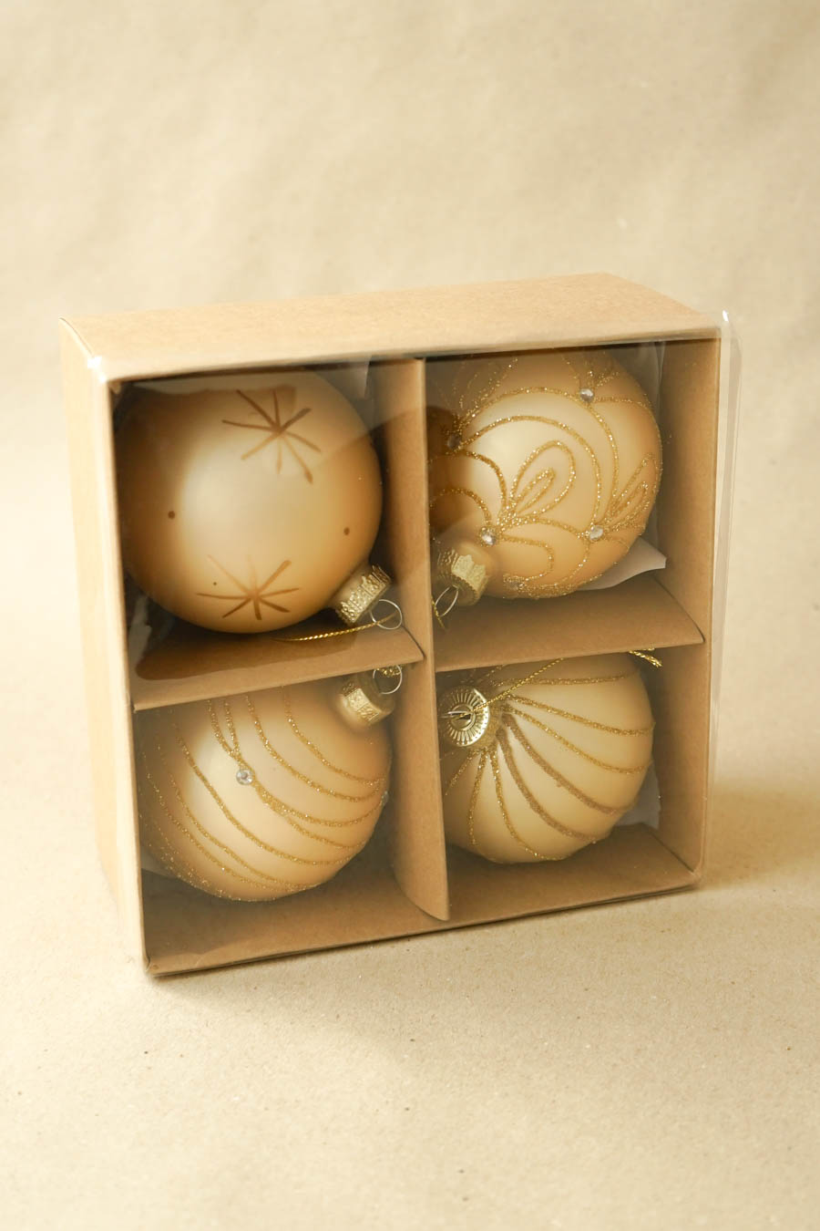 - Caja de bolas navideñas (4 bolas por caja), en tonos oro.