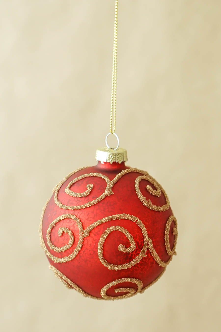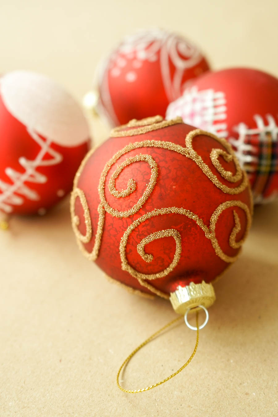 - Caja de bolas navideñas (4 bolas por caja), en tonos rojos.