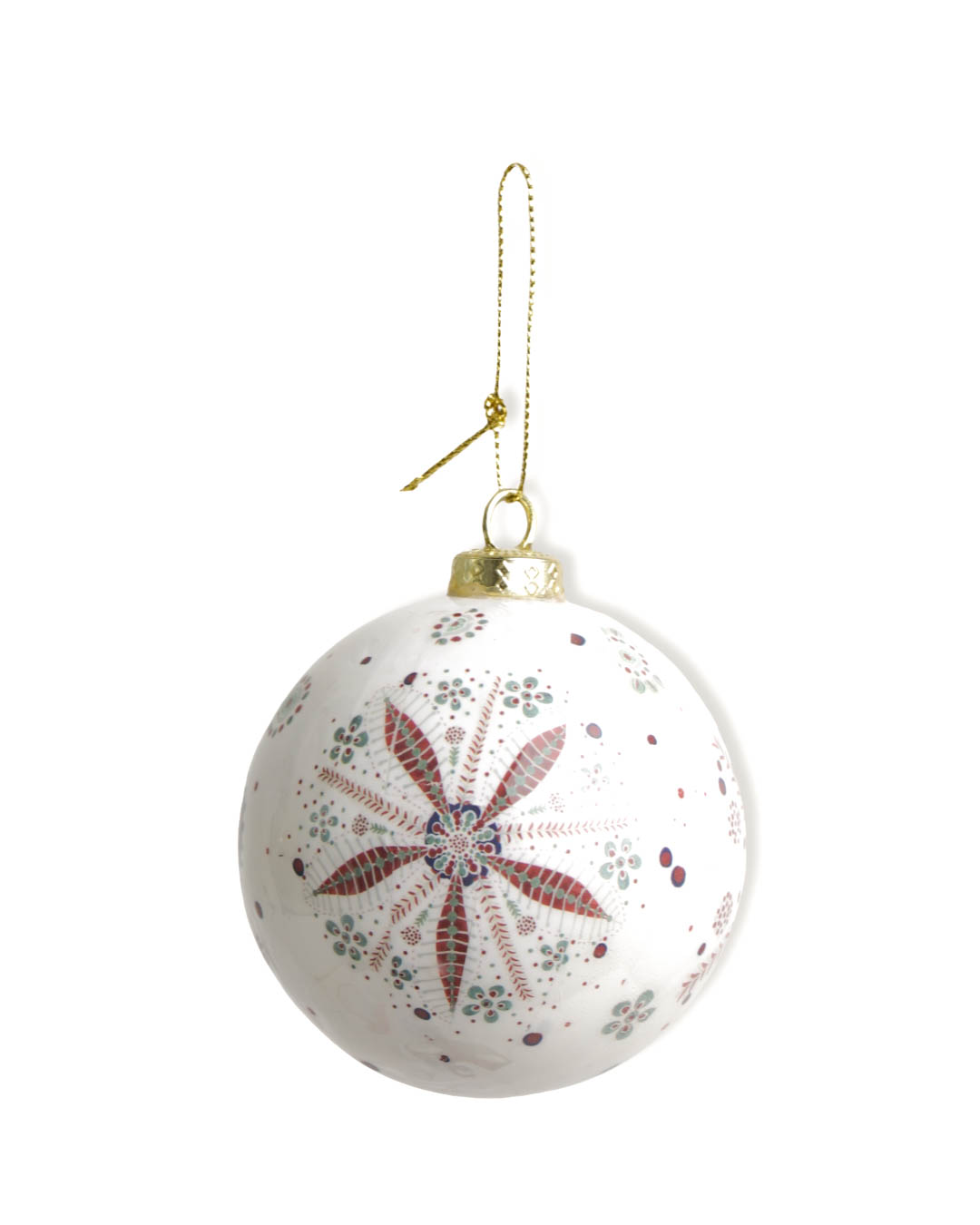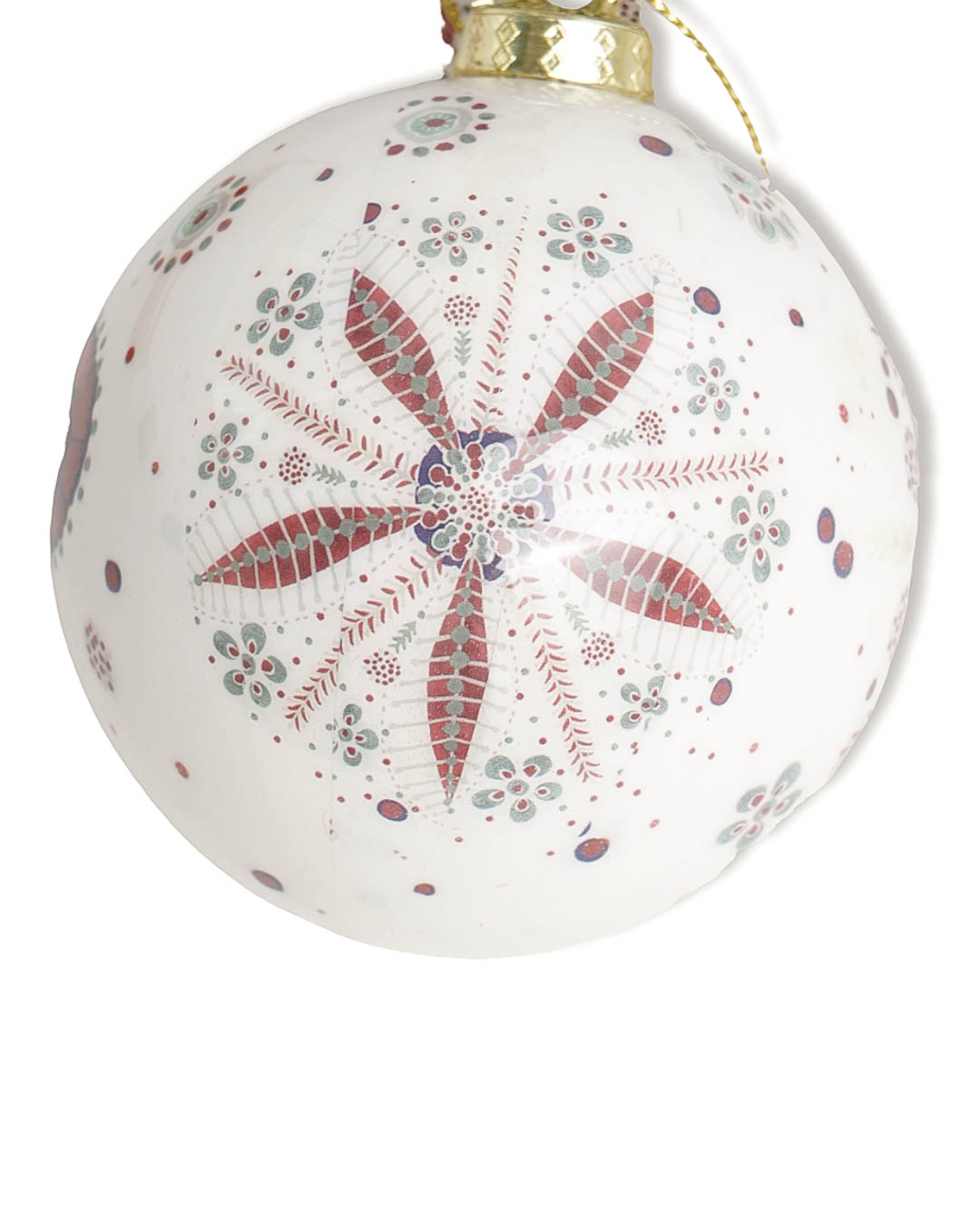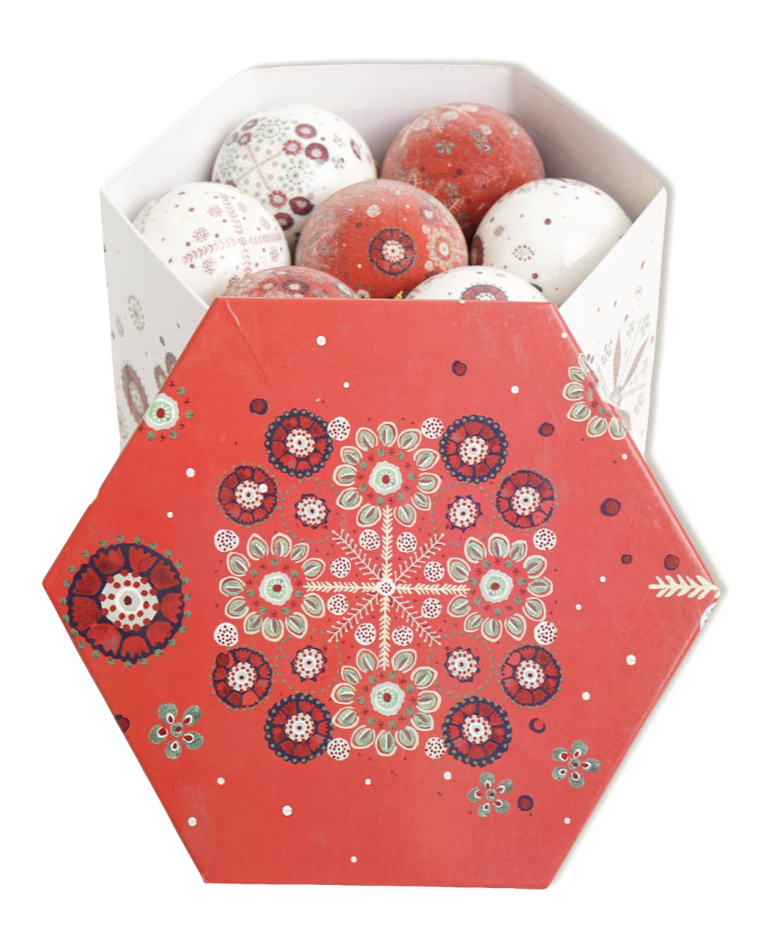 - Caja Navideña con 14 bolas decorativas en tonos blancos y rojos estampadas.