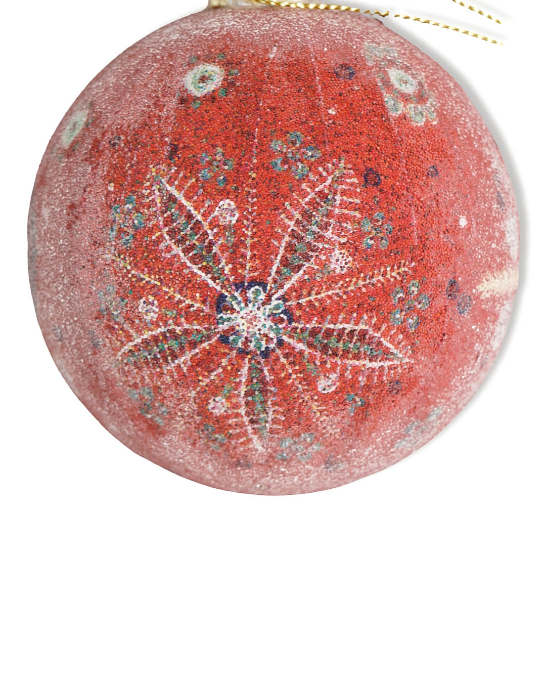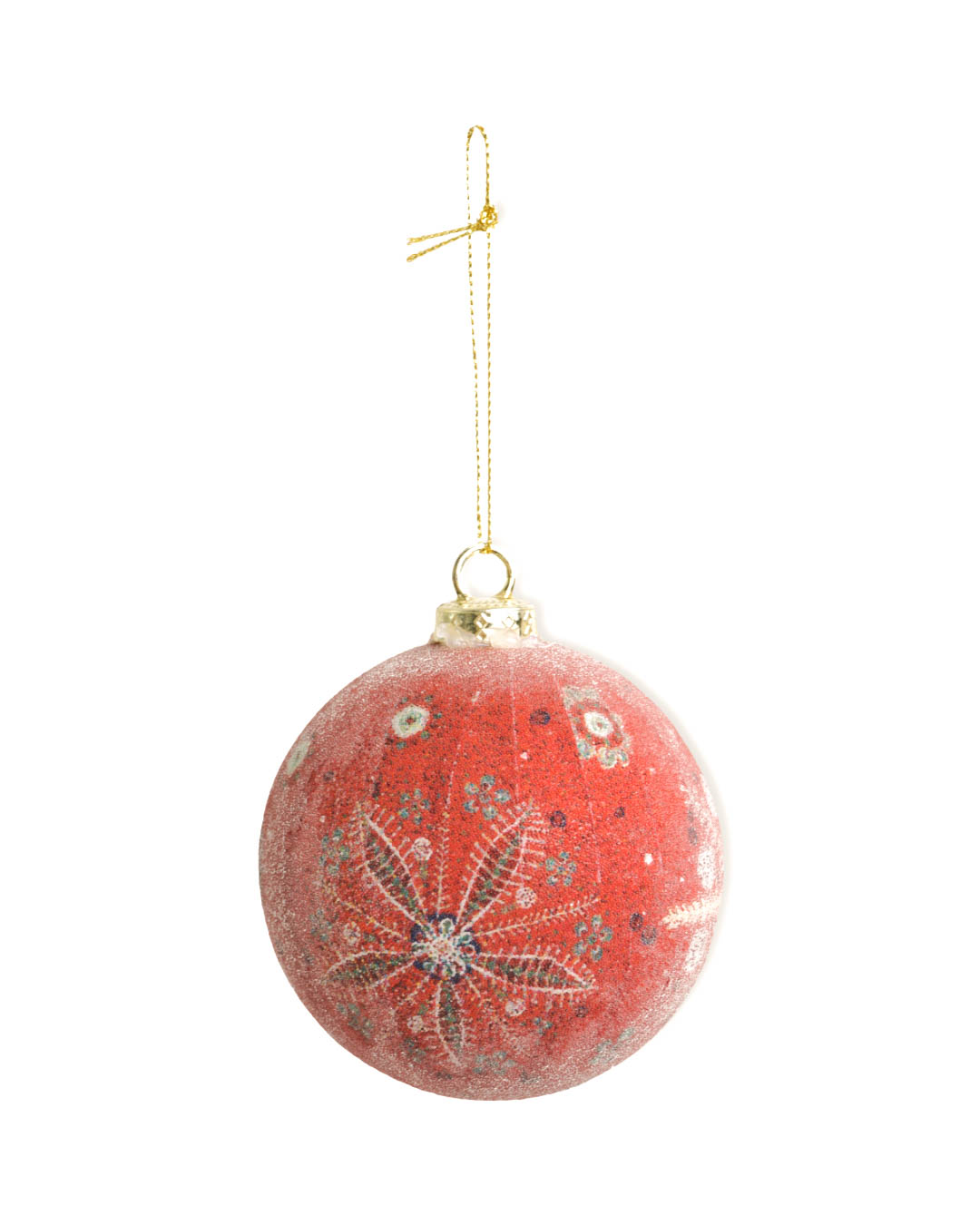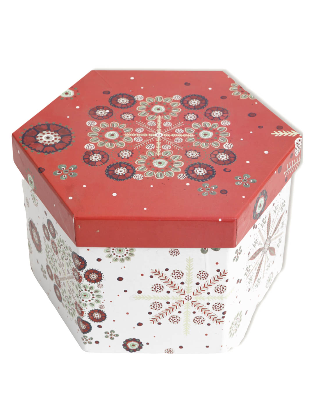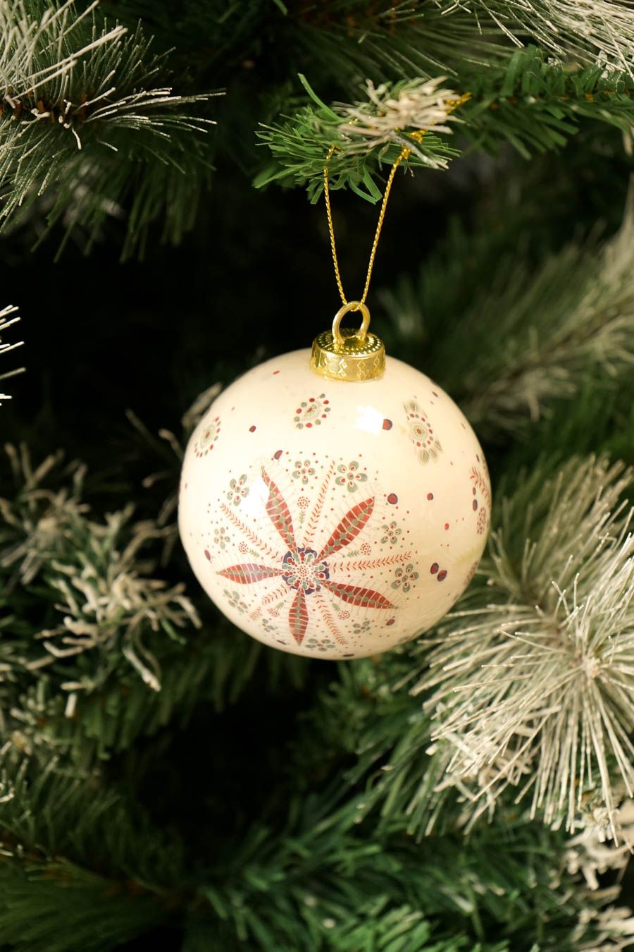 - Caja Navideña con 14 bolas decorativas en tonos blancos y rojos estampadas.