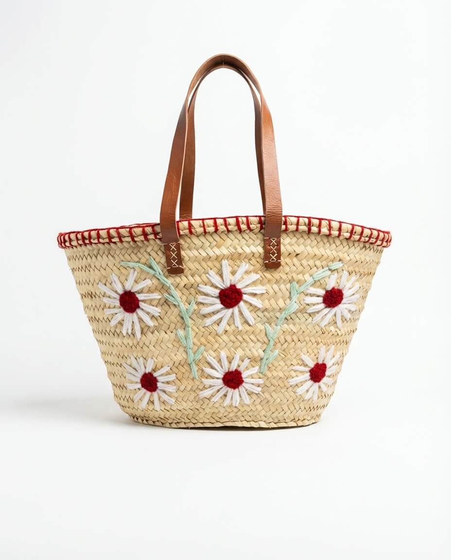 Capazo de Playa Flores Rojas Bordadas