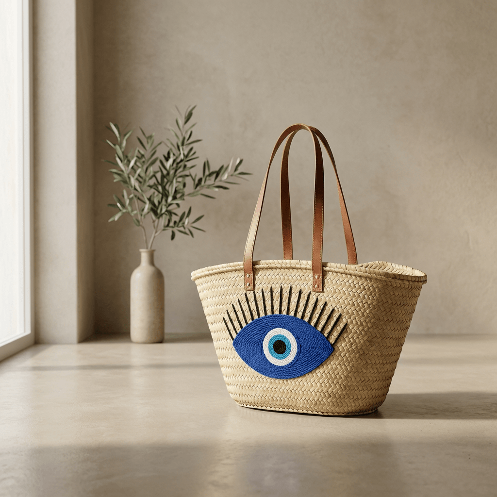 ¿Buscas un capazo de playa que combine estilo y protección? 🧿 Este precioso capazo con ojo turco azul es tu compañero perfecto para el verano. Elaborado artesanalmente en Marruecos con palma natural y detalles en lana, cada pieza es única. Sus asas de piel auténtica aportan ese toque elegante que tanto te gusta, mientras el amuleto ojo turco te acompaña con buena energía. Ideal para lucir en la playa, la piscina o tus paseos de verano ☀️