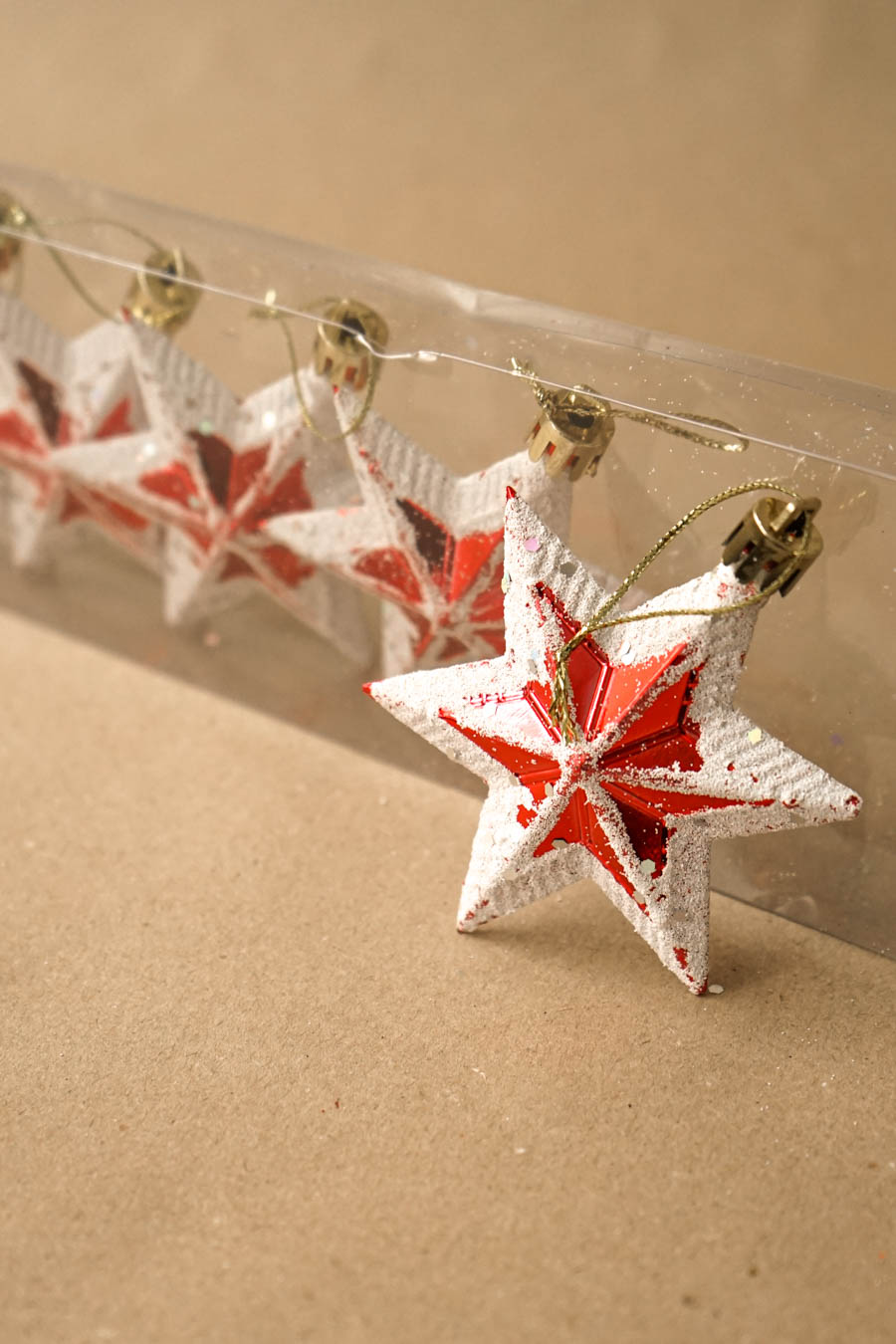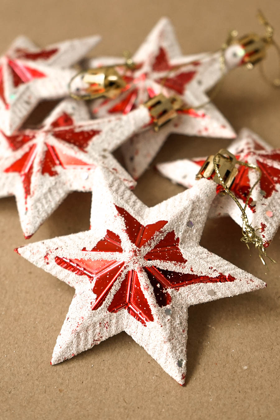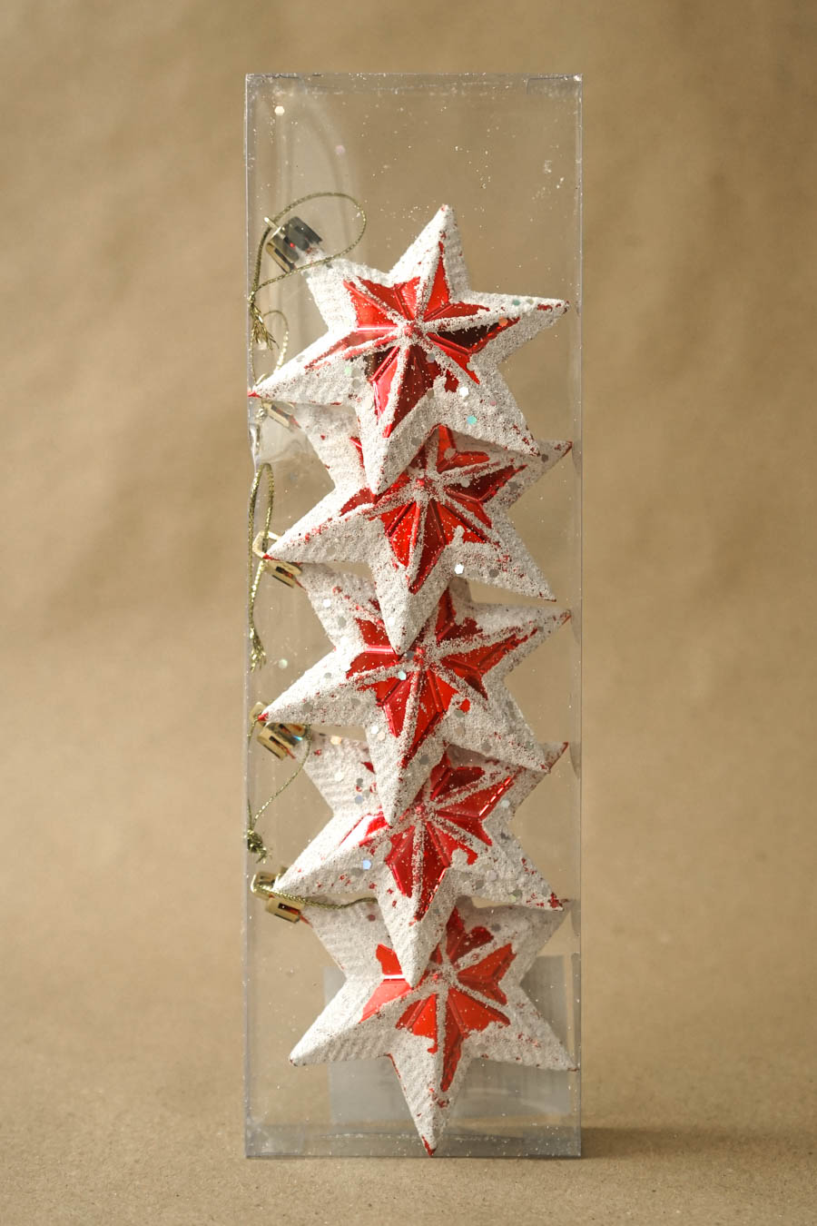 - Colgantes Navideños en forma de estrella en tonos rojos y blancos, efecto nieve. (Caja 5 estrellas)