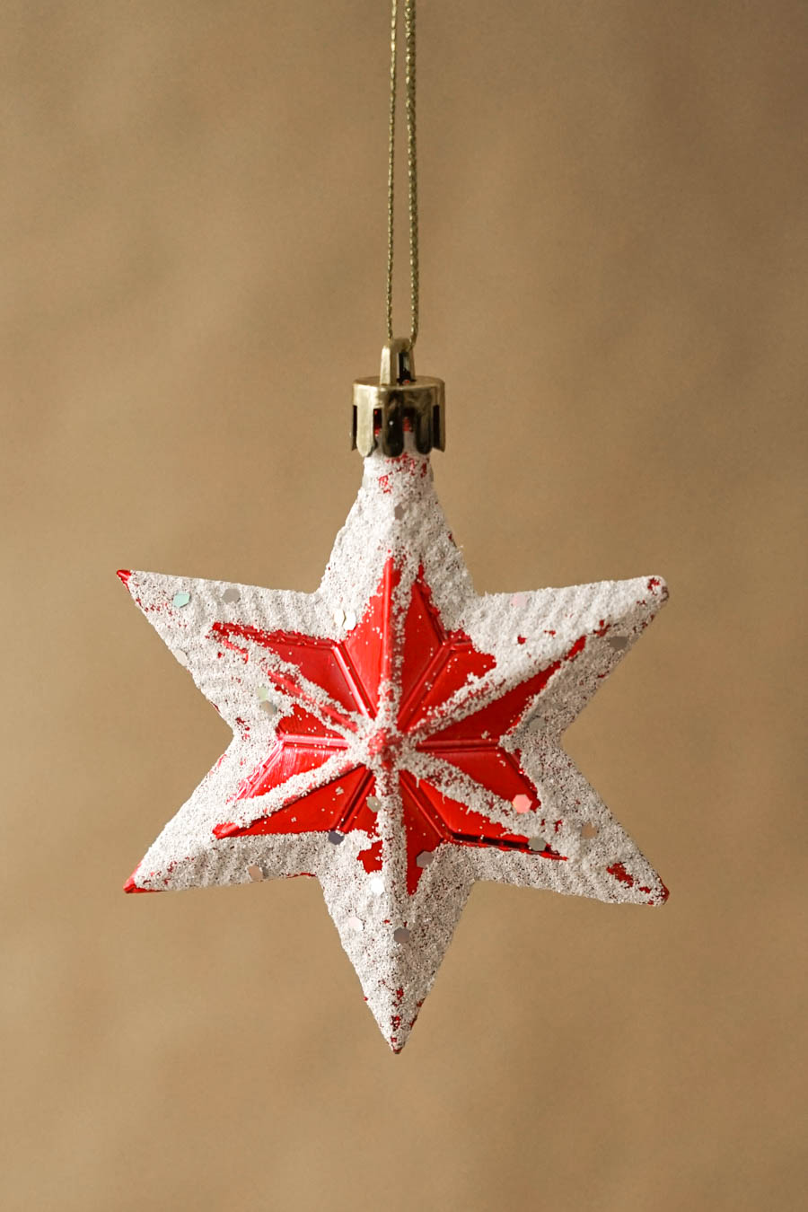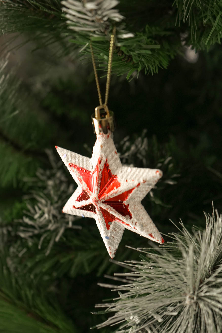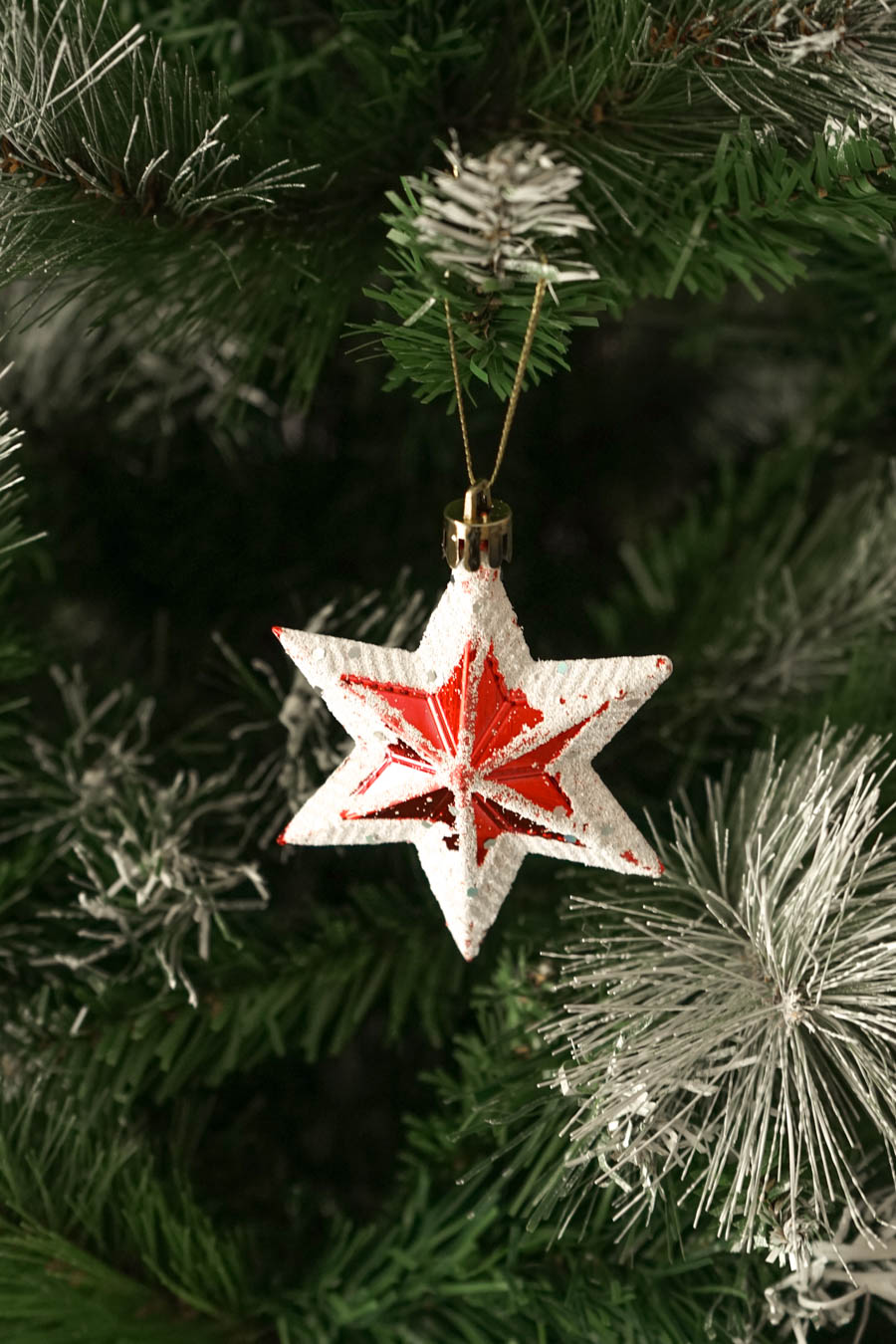 - Colgantes Navideños en forma de estrella en tonos rojos y blancos, efecto nieve. (Caja 5 estrellas)