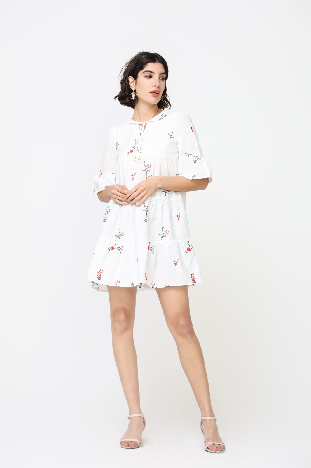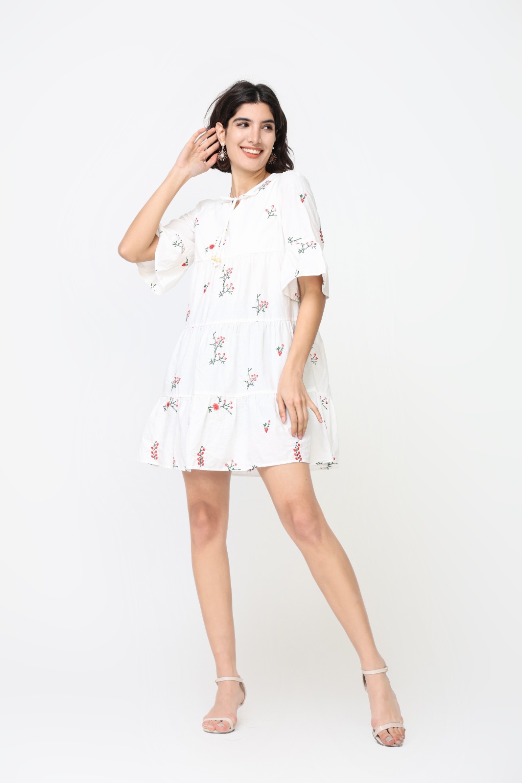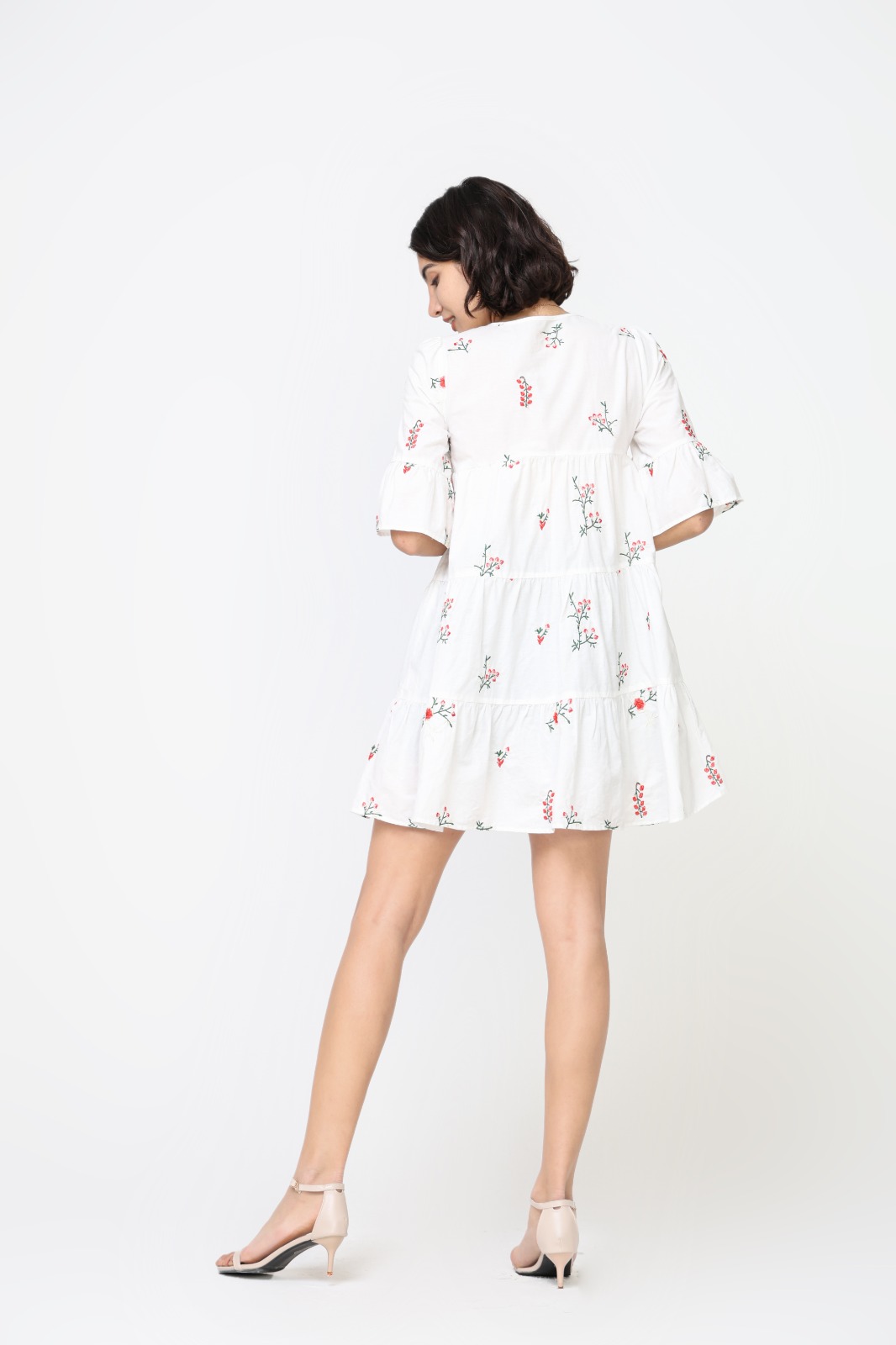 Vestido Corto Blanco Flores Rojas Manga Campana