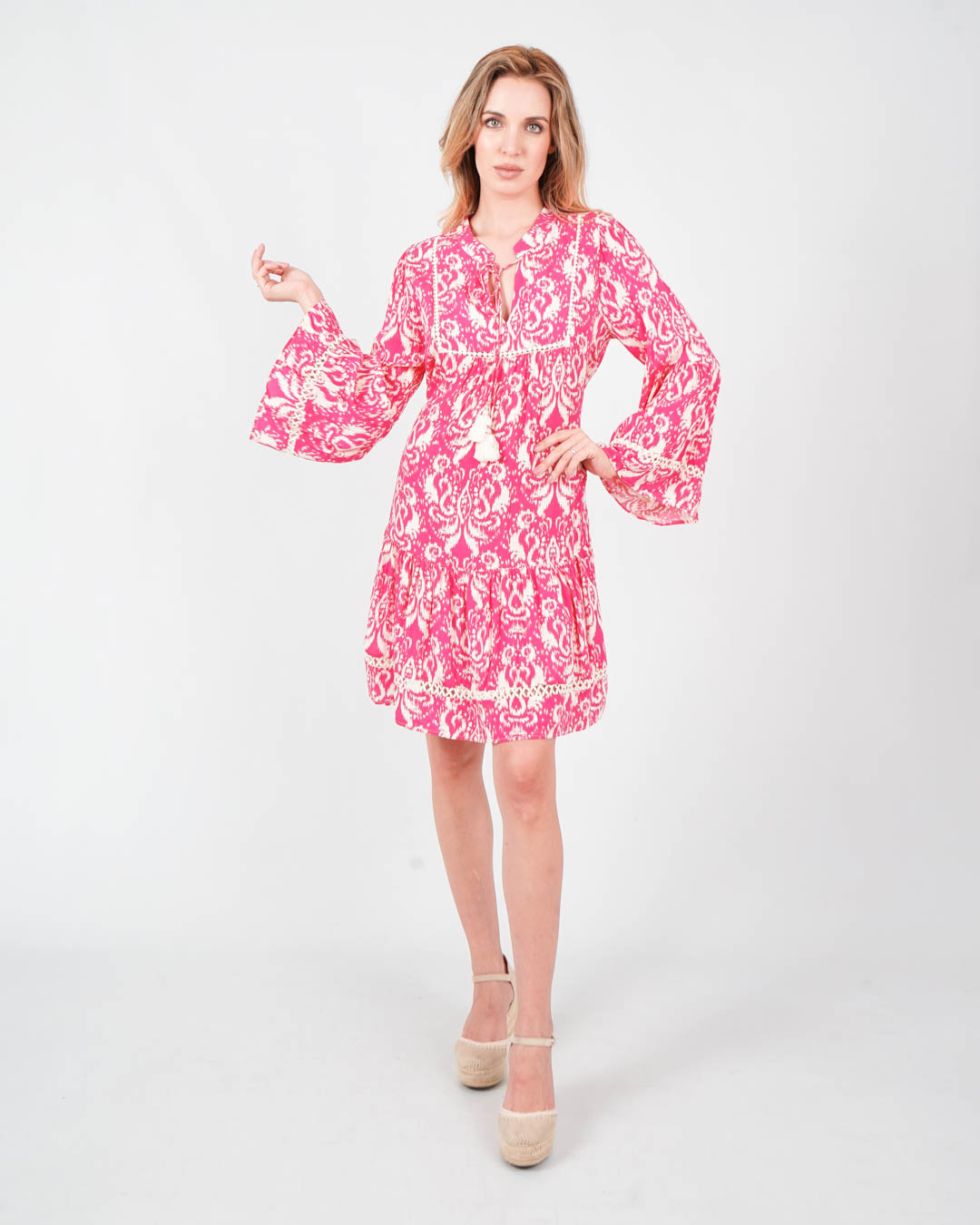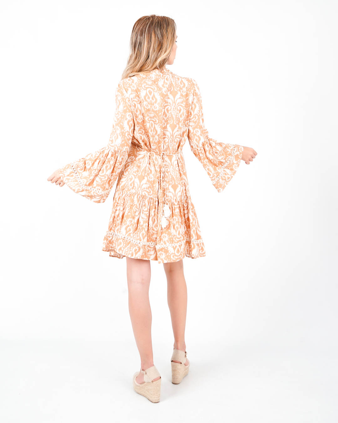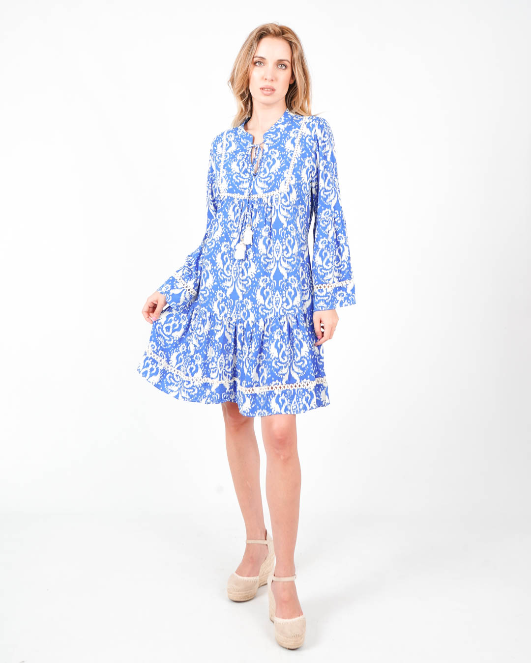 Vestido Corto Manga Larga Volante Estampado Flor De Lis