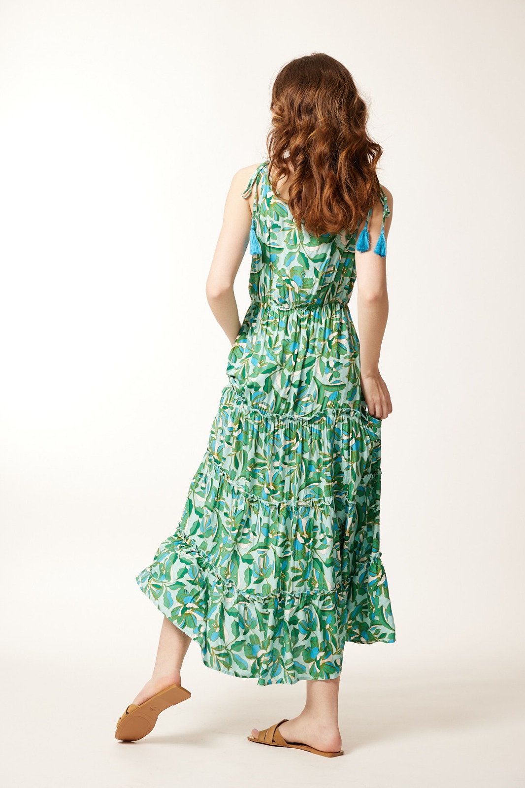 Vestido Largo Estampado Verde Tirantes Lazo Cintura Elástica Escote V