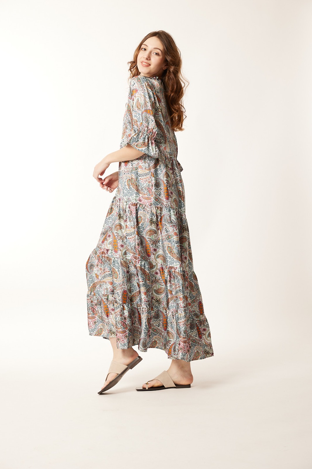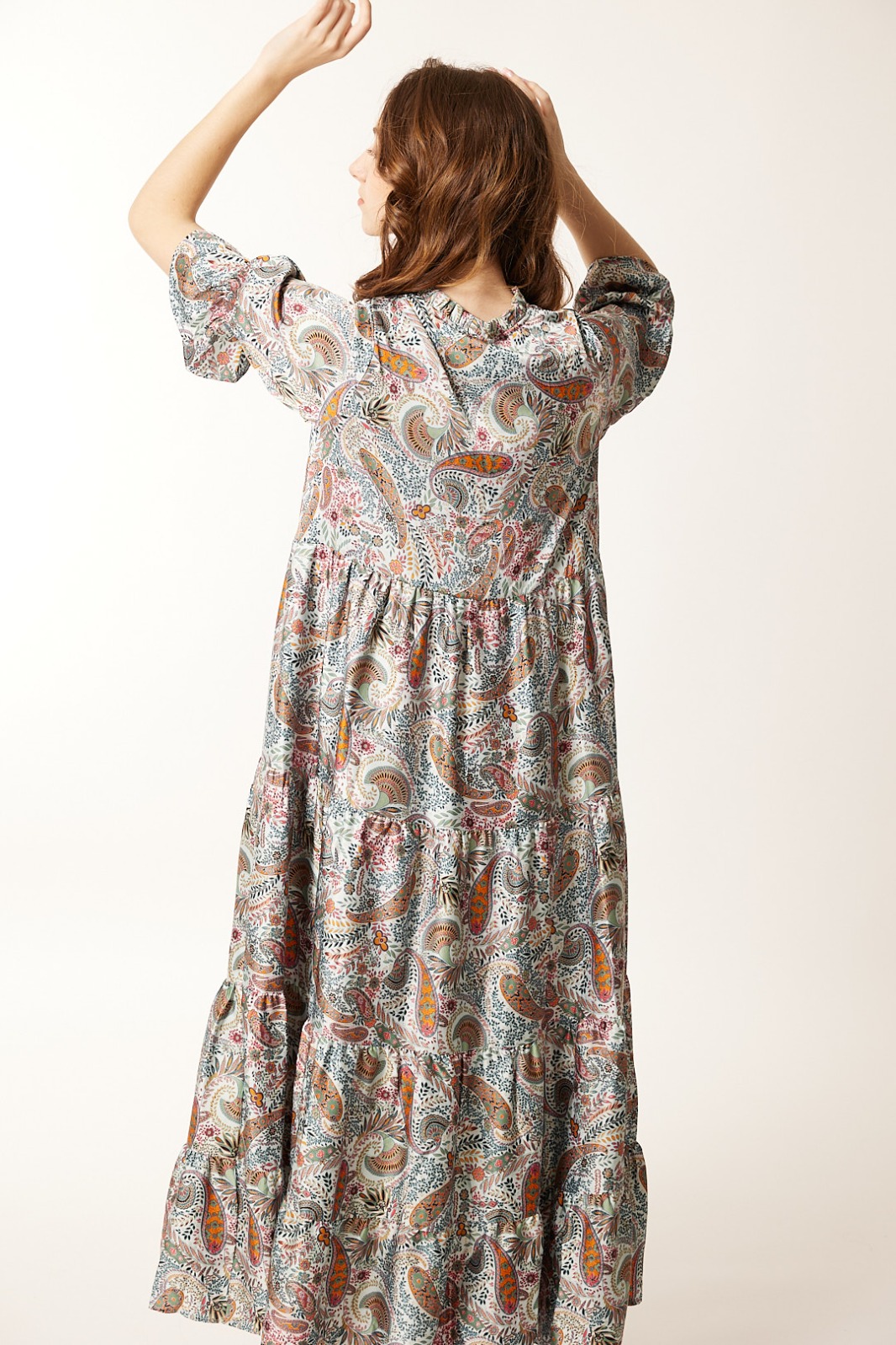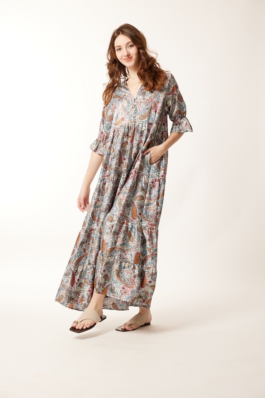 Vestido Largo Verde Estampado Escote V Botones Manga al Codo Volante Bolsillos