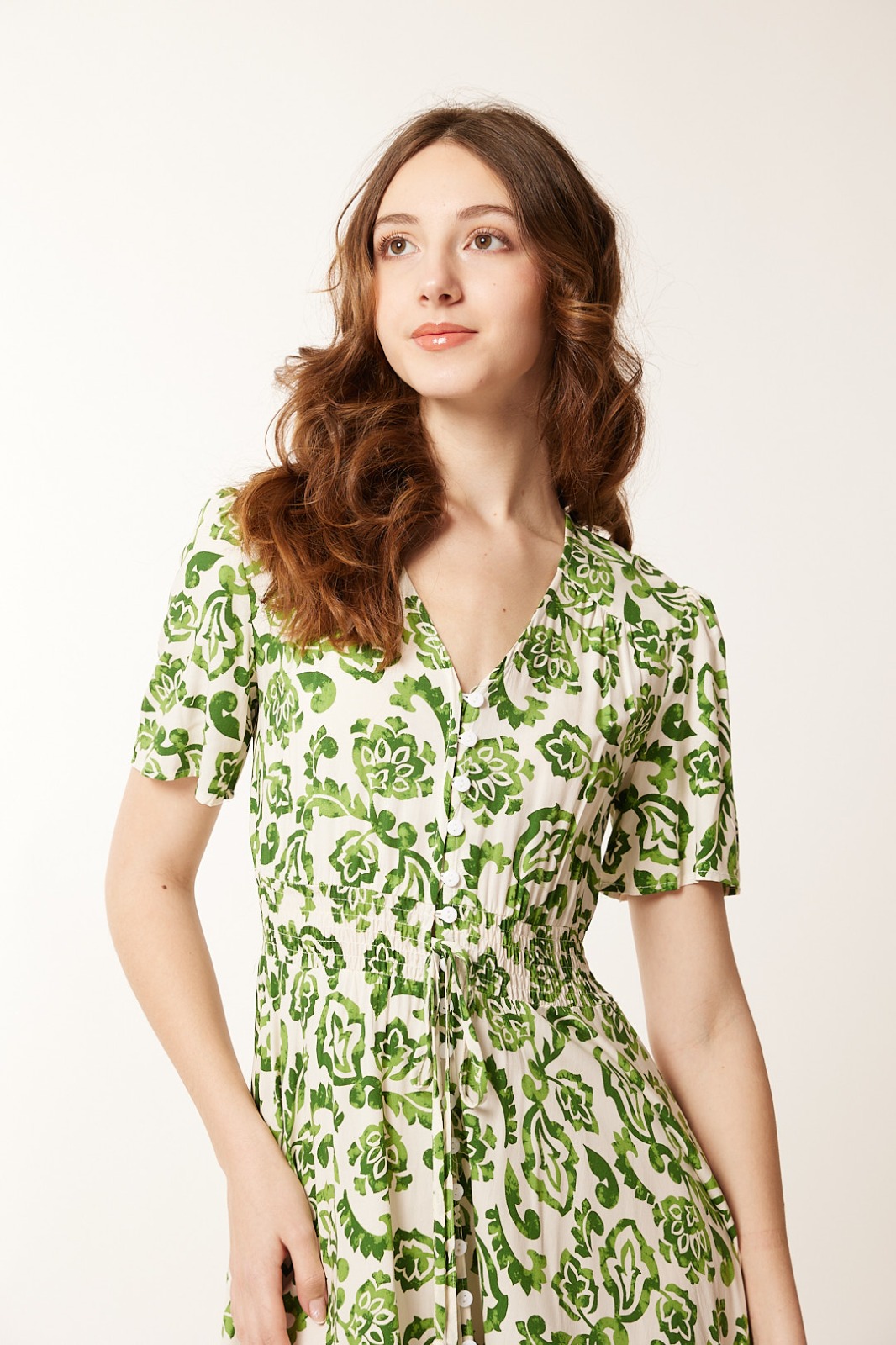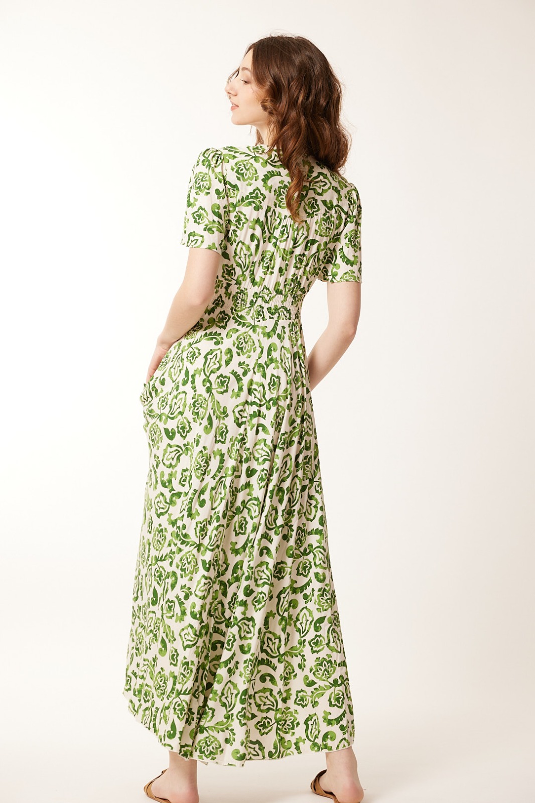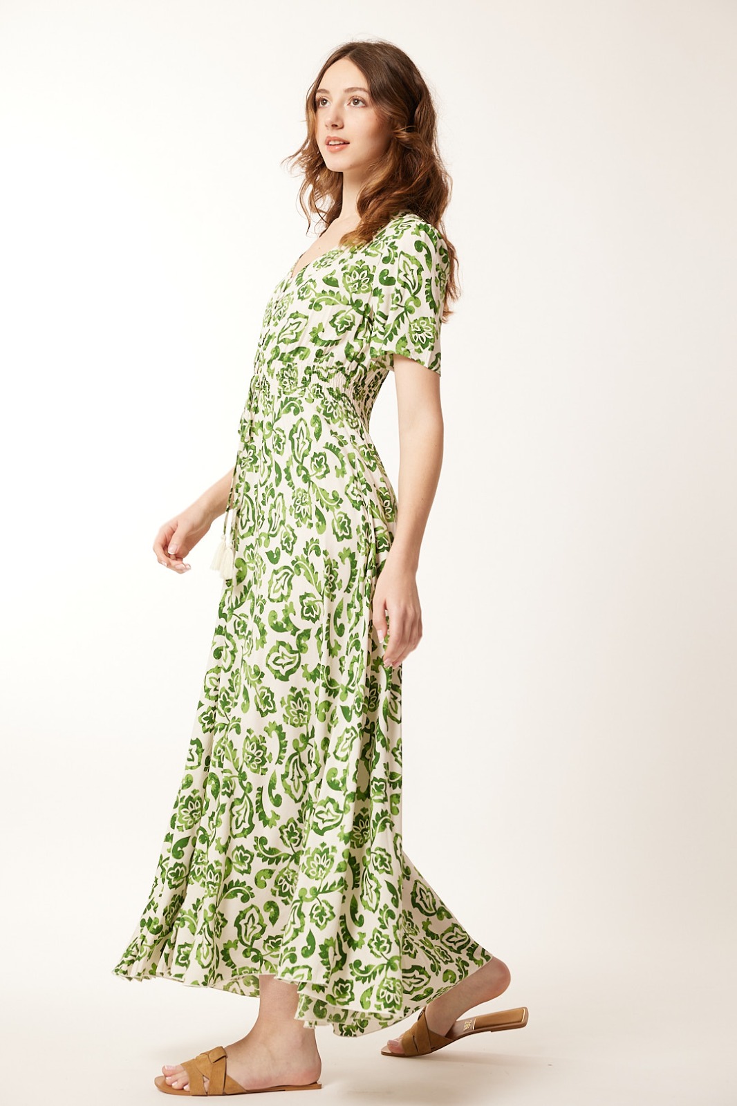 Vestido Largo Verde Estampado Manga Corta Cierre con Botones Cintura Elástica Tiras