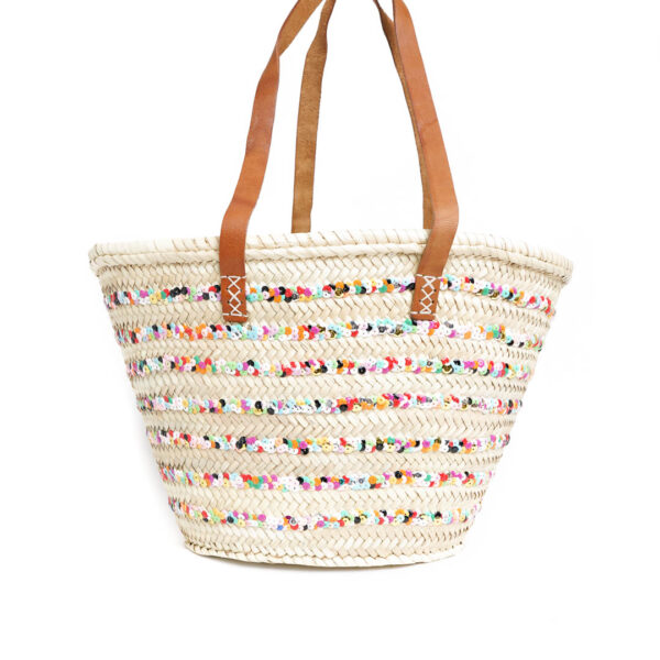 Capazo de Palma Natural con Asas de Piel y Lentejuelas Multicolor