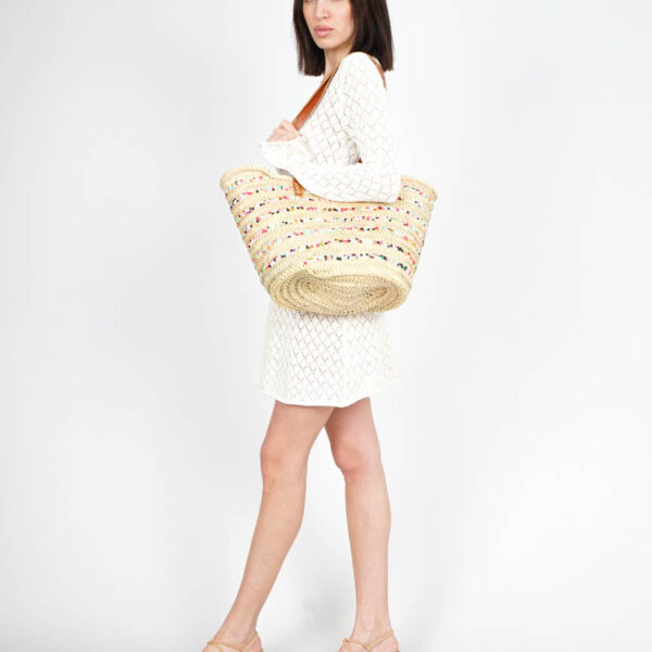 Capazo de Palma Natural con Asas de Piel y Borlas Multicolor Hilo